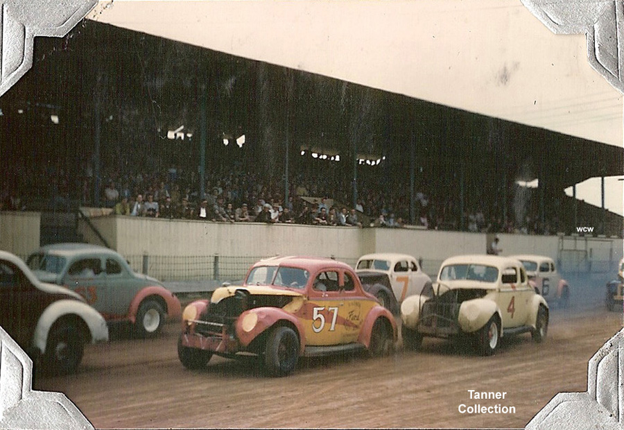 The rear of Frankie Schneider's #88 on the left, Bill Tanner Jr in the Sycamore Special #4, Red Tomlinson in the #7, and Tommie Coates in the Walt Siwak #6.