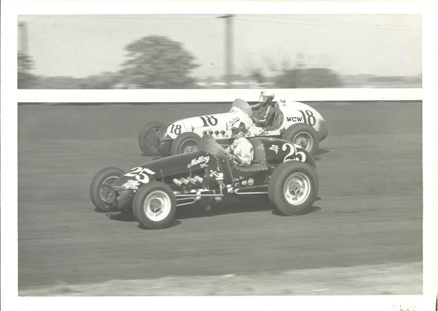 Wally Campbell driving in relief of Bob Scott in the Ray Brady #18 champ car battles Jimmy Reece in the #25.